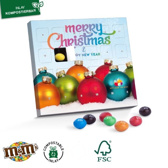 So ist dieser kleine Tisch Adventskalender mit MundMs gefüllt aus klassischer FSC-zertifizierter Vollkartonhülle aus nachhaltiger Forstwirtschaft. Zudem hat er einen ausklappbaren Tischaufsteller und ein kompostierbares Inlay. Sie können aber auch ab 1.050 Stück mit Aufpreis die Kalenderhülle aus Graspapier bestellen. Aus diesem Grund ist dieser Adventskalender mit M&Ms als Geschenk etwas ganz besonderes. Ebenfalls zeigen Sie Ihren Kunden, dass Sie auch an die Umwelt denken.