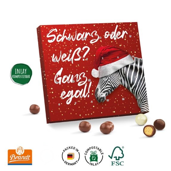 Dadurch ist dieser Adventskalender der Marke Brandt als Werbegeschenk zu 100% klimaneutral und Sie zeigen Ihren Kunden, dass Sie an die Umwelt denken. Darüber hinaus ist der Adventskalender gefüllt mit 24 Knusperkugeln der Marke „Brandt“, liegend im kompostierbaren Inlay. Dabei können Sie aus zwei verschiedenen Füllungen auswählen.