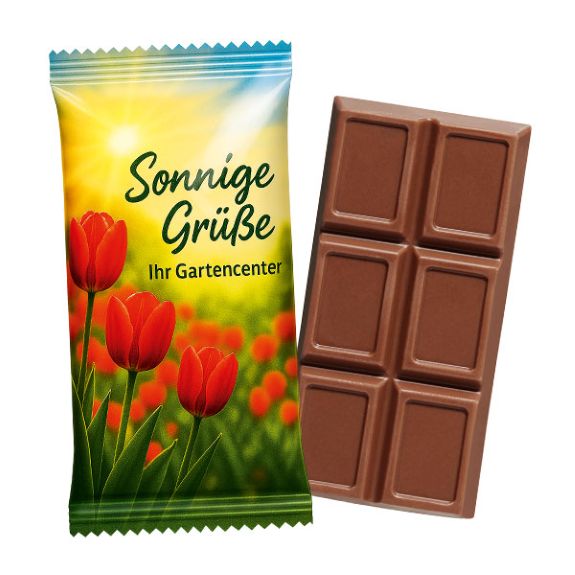 Wenn Sie Ihren Kunden eine Freude machen wollen, dann entscheiden Sie sich die Fairtrade Schoko-Tafel aus feinster Deutscher Edel-Vollmilchschokolade individuell zu bedrucken. Weiterhin hat die Schokotafel einen Kakaoanteil von 35% mindestens. Ebenfalls ist jede Schokoladentafel einzeln verpackt im Werbeflowpack aus weißer Folie.