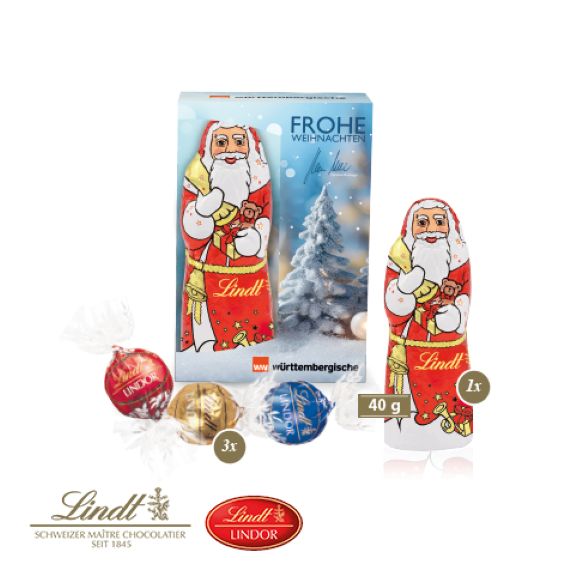 Lindt Weihnachtsmann Präsent mit individuellem Druck als Werbegeschenk