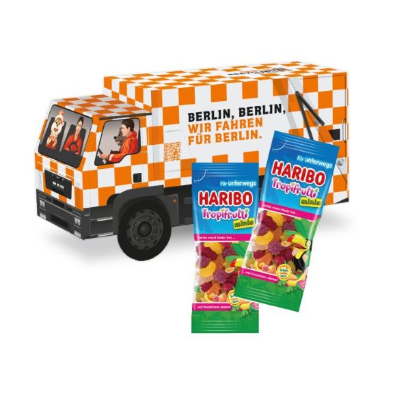 Werbeartikel als LKW mit Süßigkeiten – individuell bedruckt mit Ihrem Logo bei SÜSS UND LECKER