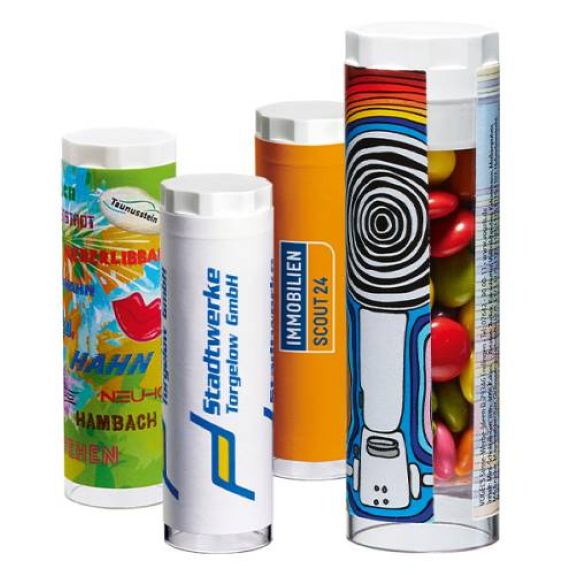 So ist die transparente Logo-Rolle mit wiederverschließbarem Deckel gefüllt mit leckeren Süßigkeiten. Darum wählen Sie aus acht verschiedenen Süßigkeiten Ihre Leckerei aus. Ebenfalls können Sie die Werbebanderole der Logo-Rolle komplett individuell bedrucken nach Ihren Wünschen. Denn damit haben Sie eine sympathische Kundenbindung zum attraktiven Preis und Sie machen Ihren Kunden eine große Freude.