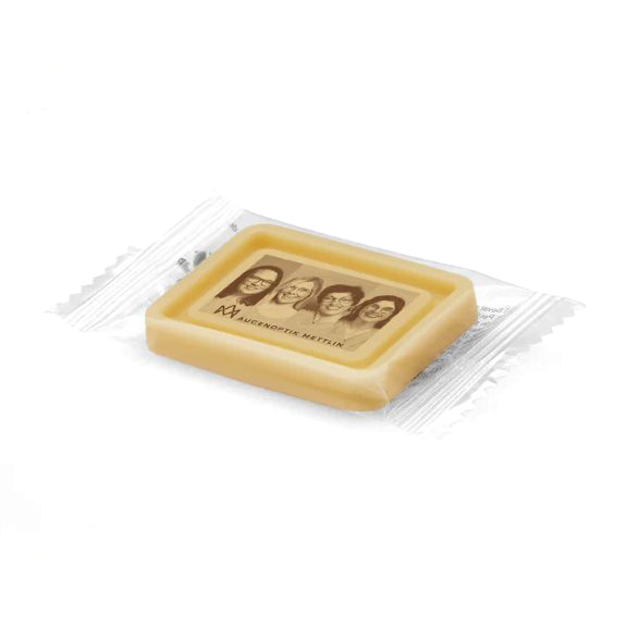 Darüber hinaus können Sie die Schoko-Täfelchen mit Ihrem Logo in 3 Geschmackssorten ab einer Mindestmenge von 1.200 Stück pro Sorte mischen. Jedoch können Sie bei der Mindestmenge von 1.200 Stück 3 verschiedene Druckmotive mischen. Weiterhin sind die Schoko-Täfelchen mit Ihrem Logo einzeln verpackt in transparenter Folie mit Druck der Deklaration auf der Rückseite.