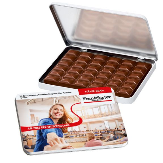 Individuelle ProduktanfrageSchokotafel mit Prägung in Werbedose aus Metall mit Ihrem Logo