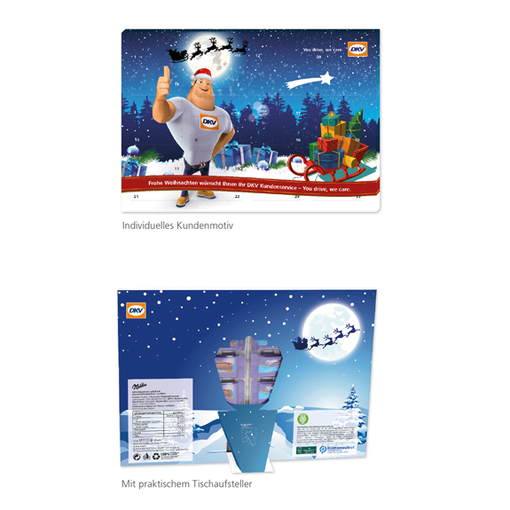 Tisch-Adventskalender mit Milka Schokolade individuell bedruckt als Werbegeschenk