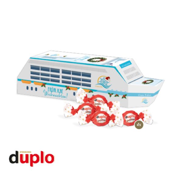 Individuelle ProduktanfrageWeihnachtspräsent als Schiff in 3D mit Süßigkeiten als Werbeartikel