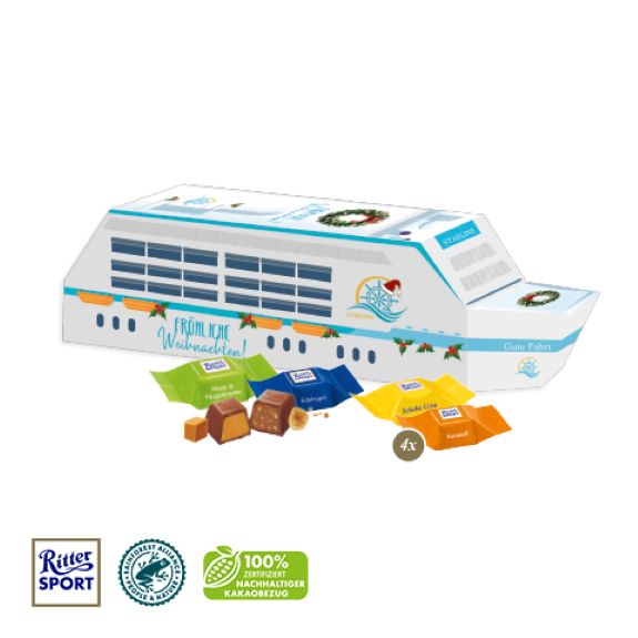 Nachhaltigkeit zu dem Schiff als Weihnachtspräsent mit Schokolade als Werbeartikel