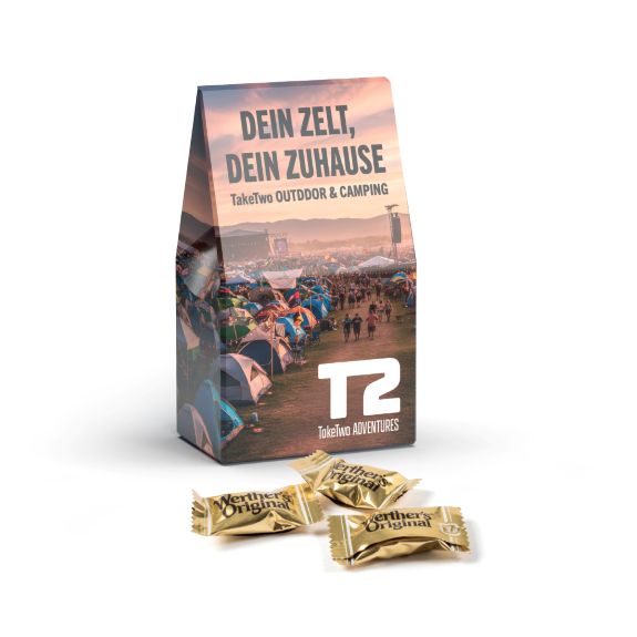 Ebenfalls sind die Werther’s Original Bonbons verpackt zu 37 g in einer Standbodenbox aus FSC-zertifiziertem Karton aus nachhaltiger Forstwirtschaft. Dabei können Sie die komplette Werbebox der Werther’s Original Bonbons als Werbemittel individuell bedrucken nach Ihren Wünschen im Digitaldruck nach 4c Euroskala.